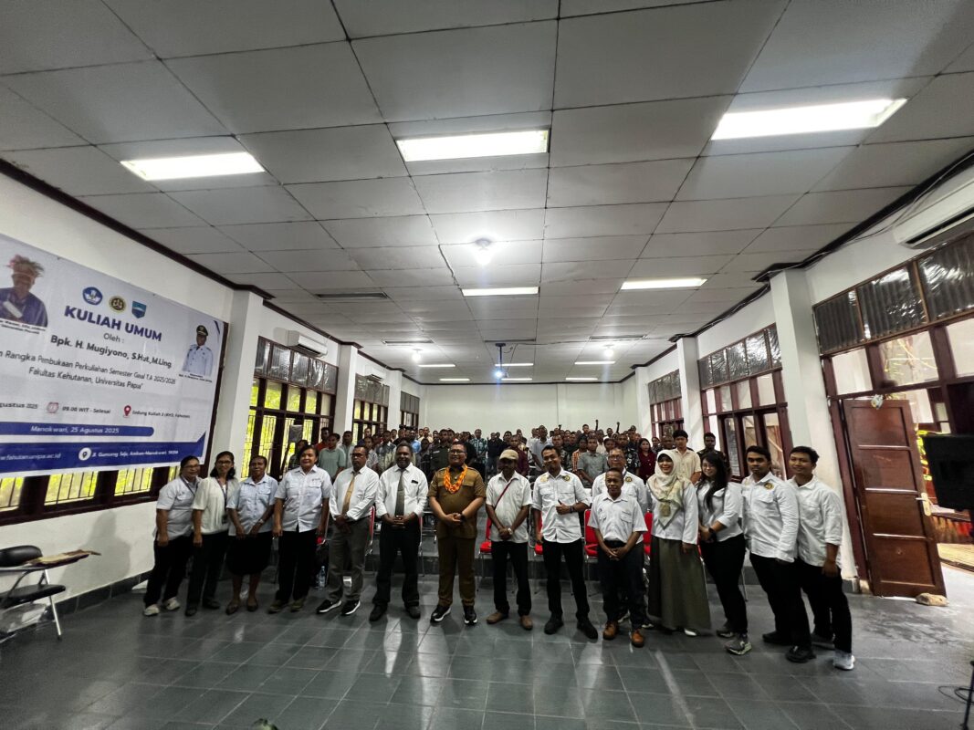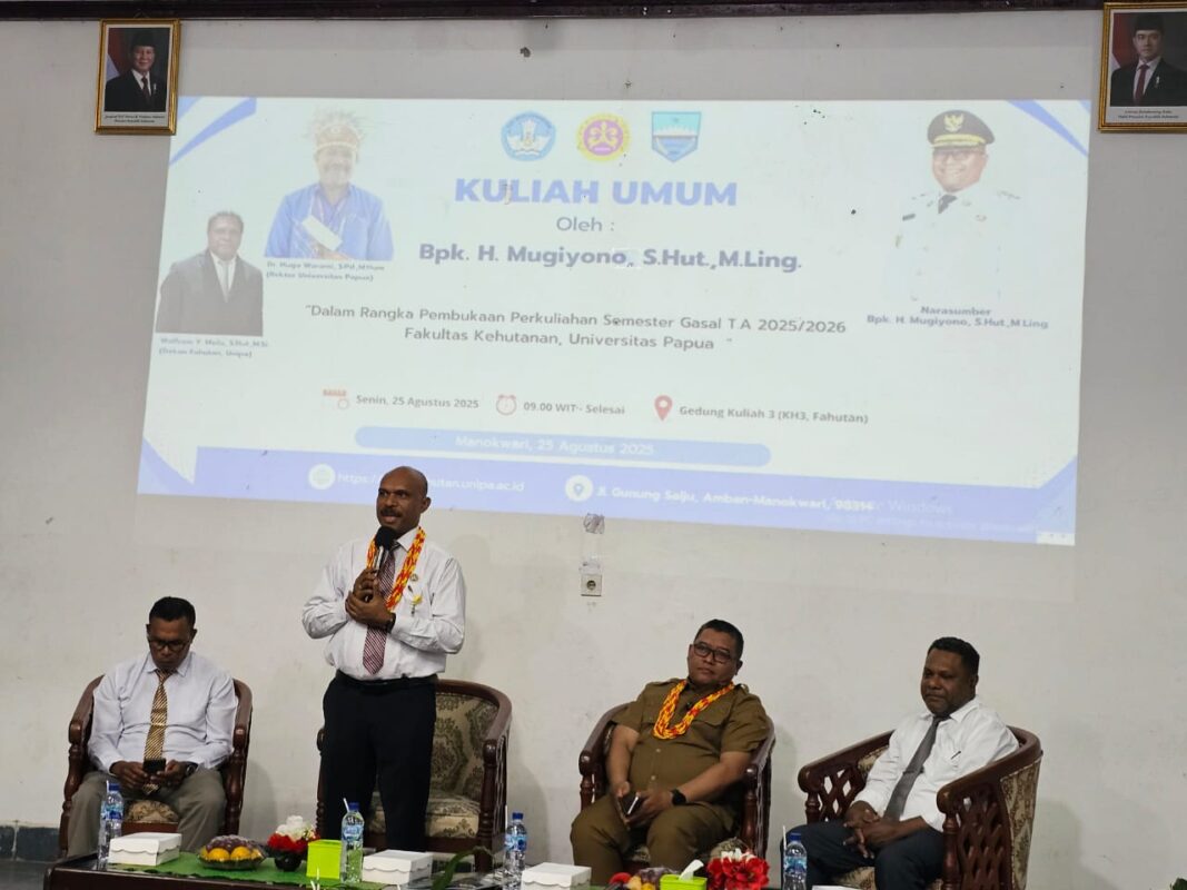 Manokwari, 25 Agustus 2025– Fakultas Kehutanan (Fahutan) Universitas Papua (UNIPA) mendapat kehormatan dengan kehadiran Wakil Bupati Manokwari, Bapak Mugiyono, S.Hut., M.Ling dalam acara kuliah umum yang berlangsung hari ini. Kuliah umum ini dihadiri oleh para dosen, mahasiswa, dan civitas akademika Fahutan. Acara Kuliah umum ini di buka secara resmi oleh Wakil Rektor Bidang Akademik Prof. Dr. Jonni Marwa, S.Hut., M.Si., IPU sekaligus memberikan sambutan mewakili rektor.